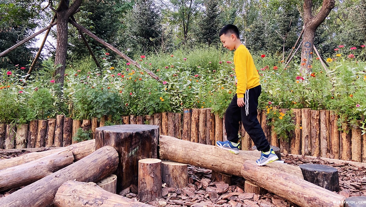 文化区利用中心林窗,打造了儿童友好空间节点——“林源撷趣”,让城市楼宇中生活的儿童得以亲近自然。空间主题是激发儿童游玩的自然属性,突显“森林文化”,打造出孩子们接触自然、认知自然的森林驿站。游具设计以及场地设计提取了众多的森林元素,布置小动物、昆虫和鸟类形象,彰显自然的生命力。场地设施全部使用天然、安全的工程材料。为营造丰富的全龄友好空间,根据分析不同年龄段儿童心理活动偏好,设置创意性主题、科普展示、益智探险、亲子互动等环节,强化在自然中游戏的体验感。譬如对自然生境的夸张演绎,其实是使用山地水冲石模拟岩石生境,营造特殊的岩石地貌景观,为儿童打造极具挑战性的游乐场所。结合儿童身体尺度和比例特征,分别设置1m和0.6m的穿梭路径,使儿童完成坐、爬、藏等活动。