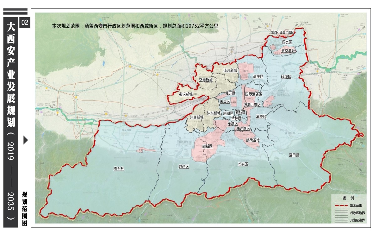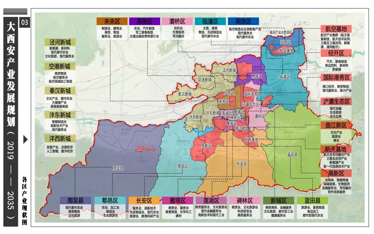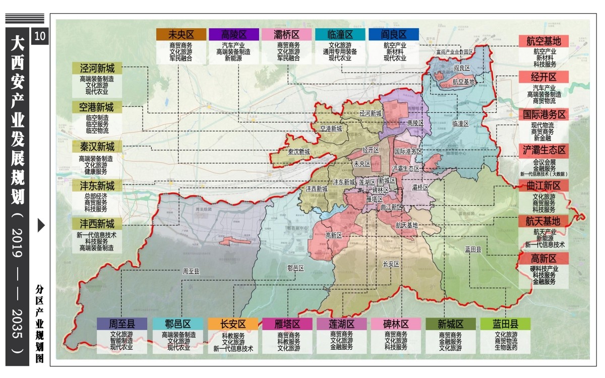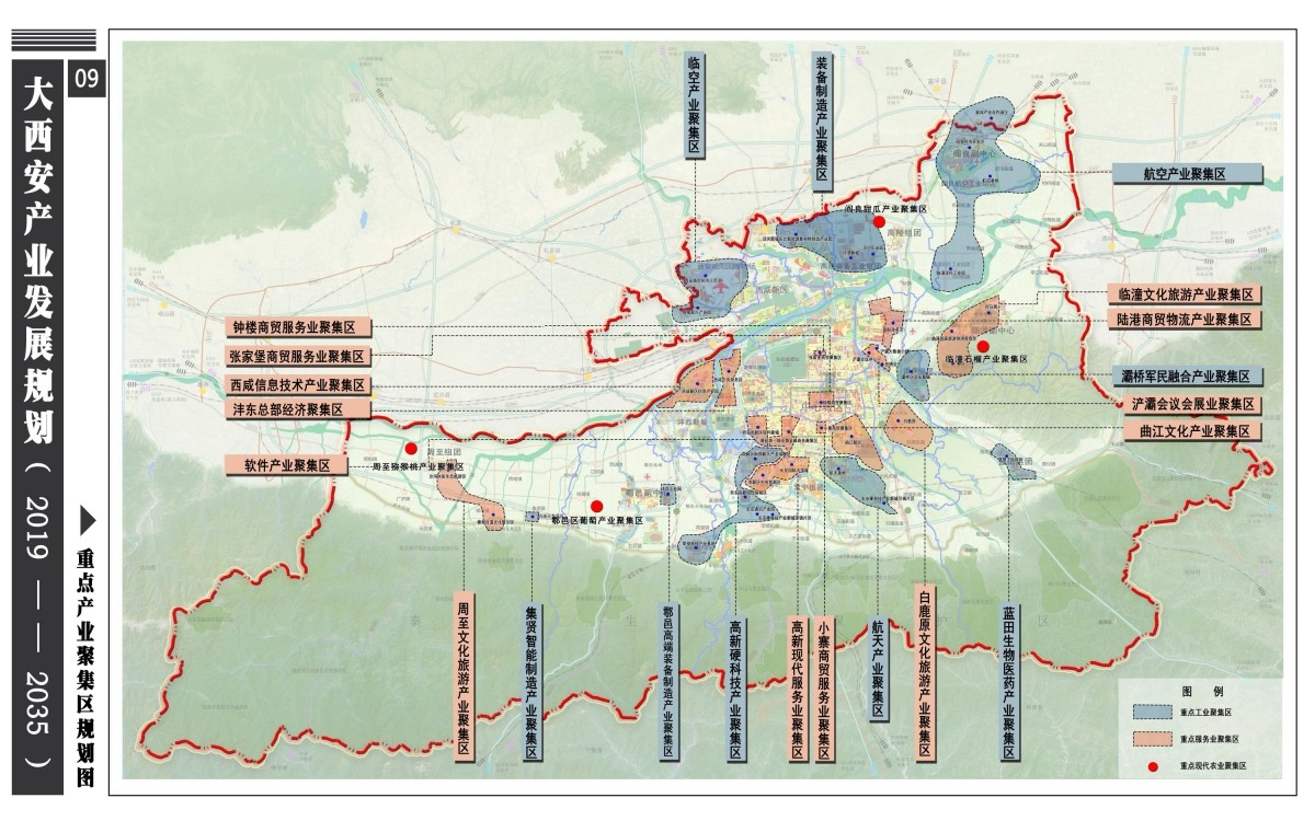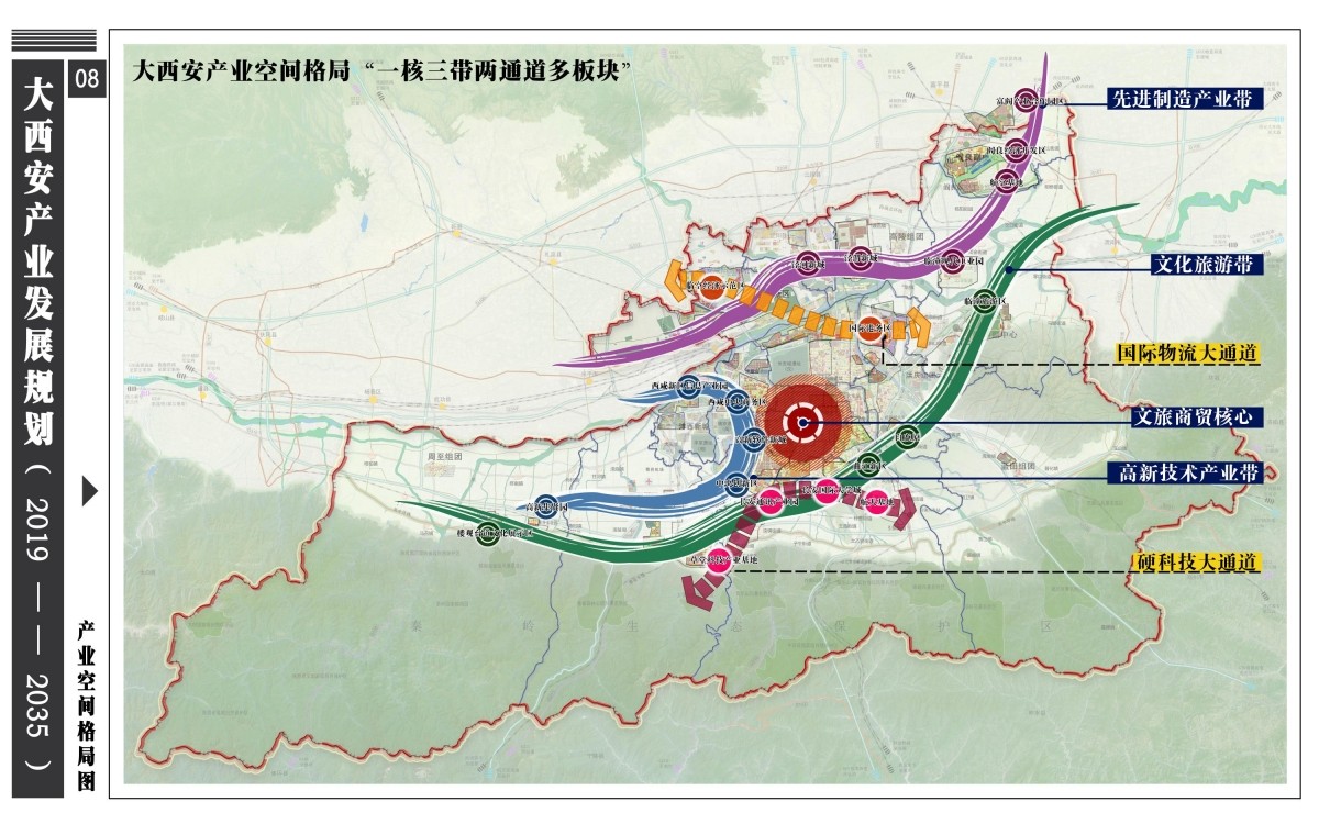 近年来,大西安围绕“聚焦三六九,振兴大西安”战略目标,硬科技产业化加速落地,新经济探索密集实践,新业态新产业竞相涌现,产业发展全面提速。但面对新时代和国家赋予大西安的新要求,存在各区(县)、西咸新区、开发区产业空间布局较乱,招商同质化竞争严重,具有全球竞争优势的产业集群和产业链还没有形成等诸多问题。面对这些问题,必须尽快制定岀顶层性、系统性、全域性、前瞻性的产业发展新规划,明确发展思路、发展重点、空间布局、战略路径以及实施保障,充分释放产业发展潜力,推进大西安追赶超越。规划紧紧围绕建设国家中心城市、建设具有历史文化特色的国际化大都市,努力将大西安建设成为全球硬科技之都、中国新经济之都、中国新能源汽车之都、“一带一路”国际文化旅游名城、国家军民融合创新示范区,形成“三都一城一示范”的产业发展战略定位。依托产业基础和发展趋势,加强培育以硬科技产业为代表的未来产业,推动硬科技与数字经济、智能经济、创意经济、共享经济、绿色经济融合发展;发展壮大高新技术产业、先进制造业、离贸物流业、文化旅游业“3+1”万亿级大支柱产业,规划打造15个千亿级重点产业,构建起“13115”现代产业体系,助推“全球硬科技之都”、万亿级大产业战略目标的实现。按照“协同错位、因地制宜、集约高效、产城融合”的原则谋划产业空间布局,为未来产业预留空间,为支柱产业拓展空间,对限制产业强制腾出空间,空间上逐步形成“一核三带两通道多板块(产业聚集区)”的大西安产业总体布局。其中“一核”指位于城市空间中心的文旅商贸核心,“三带”分别指先进制造产业带、高新技术产业带和文化旅游带。“两通道”分别指国际物流大通道和硬科技大通道,“多板块”是指主要分布在“一核三带两通道”上及外围区(县)的26个重点产业聚集区。