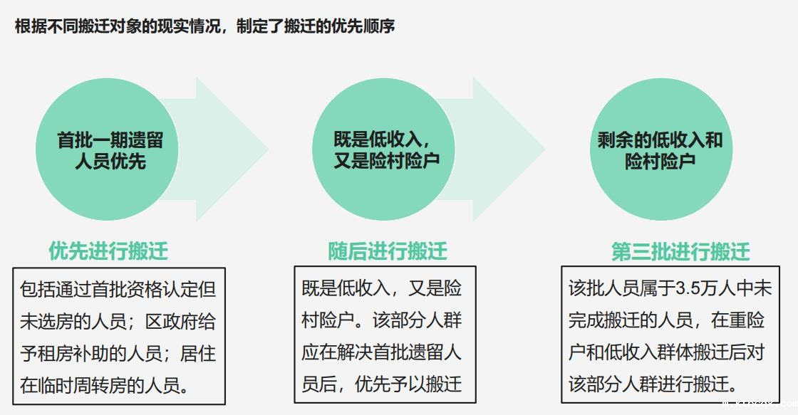 根据不同搬迁对象的市级情况,制定搬迁的优先顺序和实施计划。首批搬迁工作遗留人员优先进行搬迁,包括已经通过首批资格认定但未选房的人员、区政府给予租房补贴的人员以及居住在临时周转房的人员;既是低收入又是险村险户,随后进行搬迁;剩余的低收入和险村险户纳入最后进行搬迁。