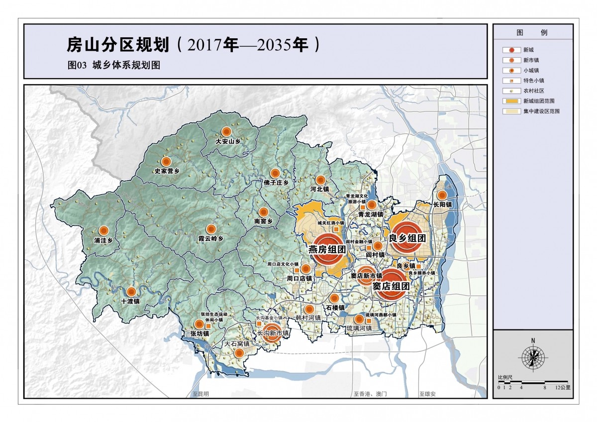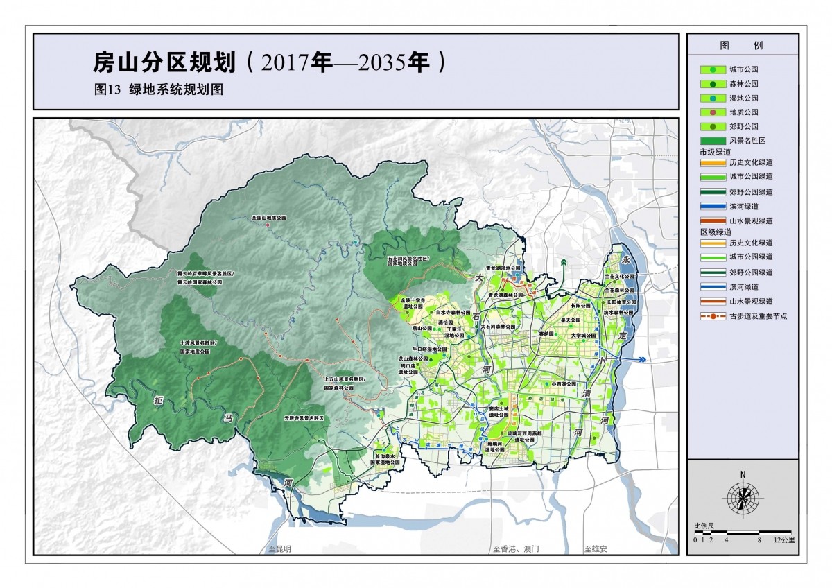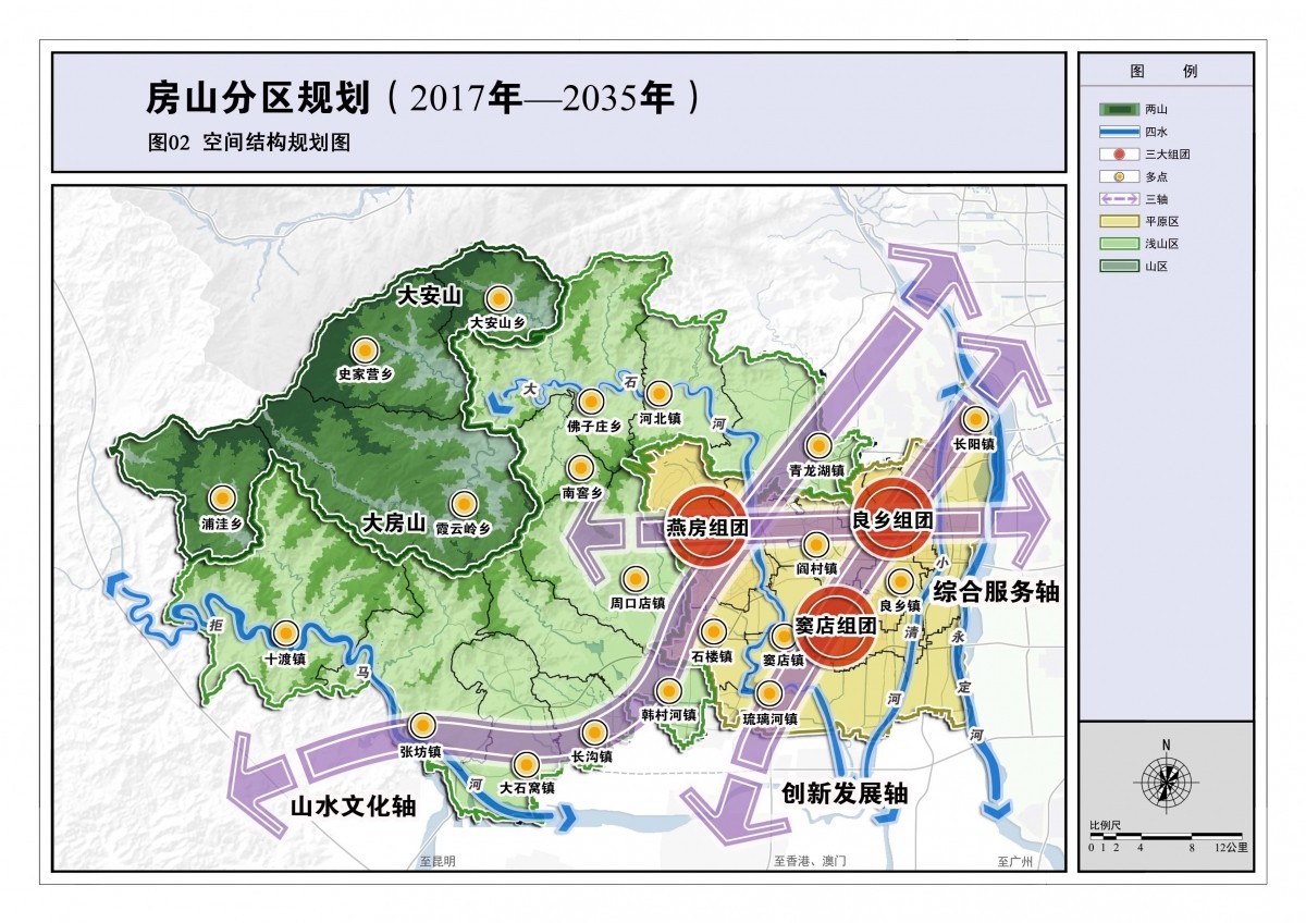 规划构思:房山是多点地区的平原新城,房山的山区又是生态涵养区的重要部分,是保障首都可持续发展的关键区域。分区规划紧紧围绕总体规划赋予房山“三区一节点”的功能定位,处理好保护与发展之间的关系,坚持生态优先,明确了“生态+发展”的规划理念,围绕“保、承、创”为主要规划主线,保障生态及能源安全,承接各类疏解管控要求,传承历史文化山水风貌,创新各领域发展模式,统筹配置各类要素,引领新时期房山实现跨越式发展。