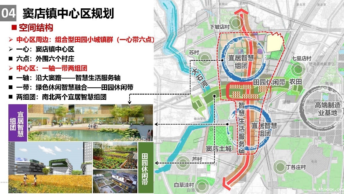 打造京西南生态宜居智慧新市镇,打造具有京南地域风貌于文化特色、魅力精致的新时代小城镇。构建“一轴一带两组团”的镇中心空间结构。规划实施借鉴北京市朝阳区“王四营模式”,研究提出镇中心区可行的规划原则和实施模式。