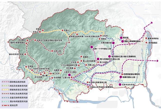 做精“一线”,国际精品旅游线路,强化国际精品旅游线路外联引流。面向国际市场,强化北京源文化和山水休闲特色,与首都北线、东线旅游形成差异定位。