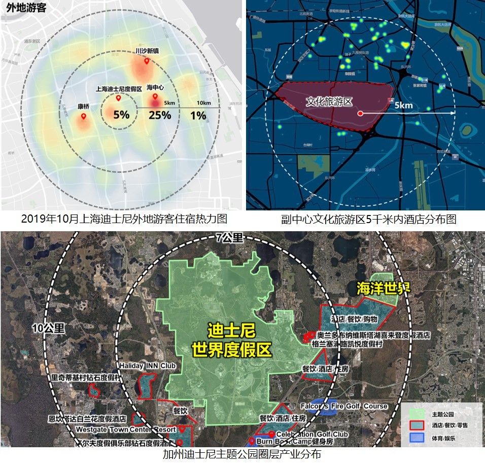 第一,对世界知名主题公园周边产业发展特征及规律进行了深入研究。主题公园周边通常具有完善的互补型配套产业链,其酒店业规模大、品质高,餐饮业内外搭配、各具特色,特色购物与主题公园共振发展;具有差异化的关联型产业链,包括数字文化总部集聚、时尚娱乐演艺提升游客过夜率、会展与娱乐产业良好互动;具有以主题公园为核心的产业圈层形态,第一圈层为互补型产业,第二圈层为关联型产业。