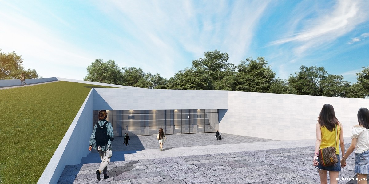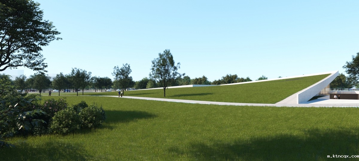 在建筑的视角下,我们希望建筑能够以一种更加开放共享的姿态来链接周边,激活城市生活。利用现状地形与景观设计,将城市会客厅设计为带有坡度的覆土建筑,会客厅屋面与景观绿地连为一体,创造建筑与周边环境有机融合的大地景观。会客厅的屋顶被设想为公共街景的延申,利用屋顶空间,形成一个俯瞰整个城市的观景台。在不干扰室内的情况下设置景观步行道,让人们漫步在自然之中,游山鉴水。