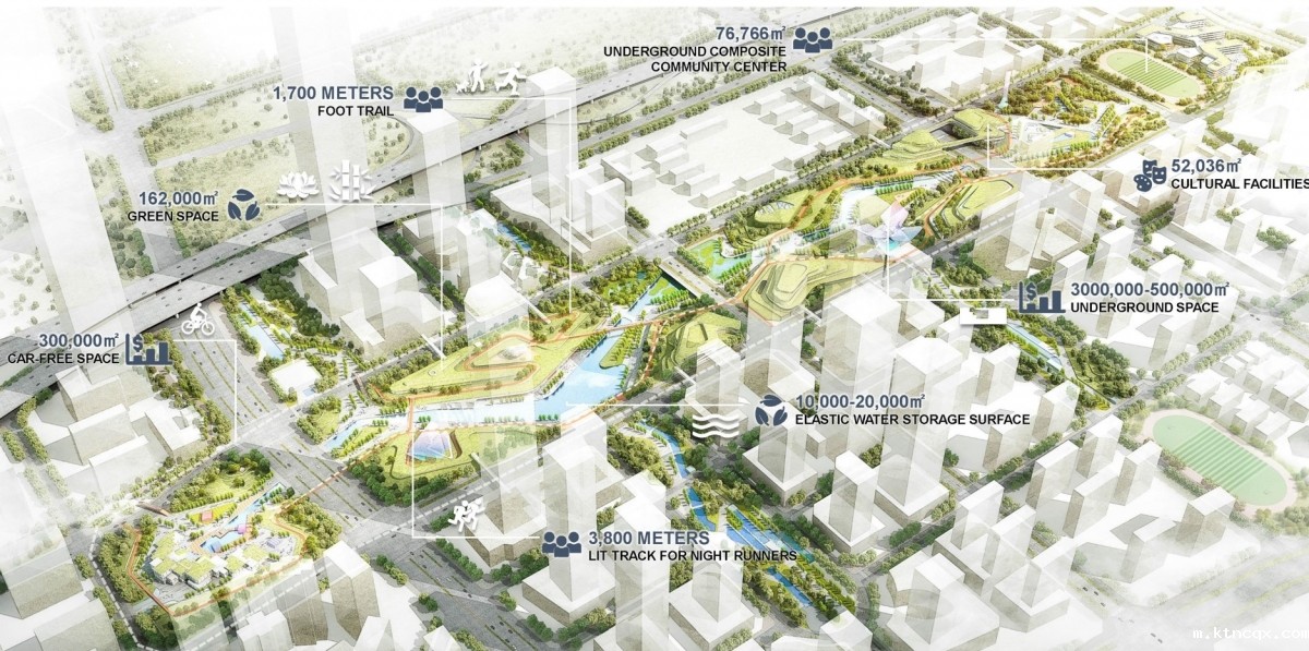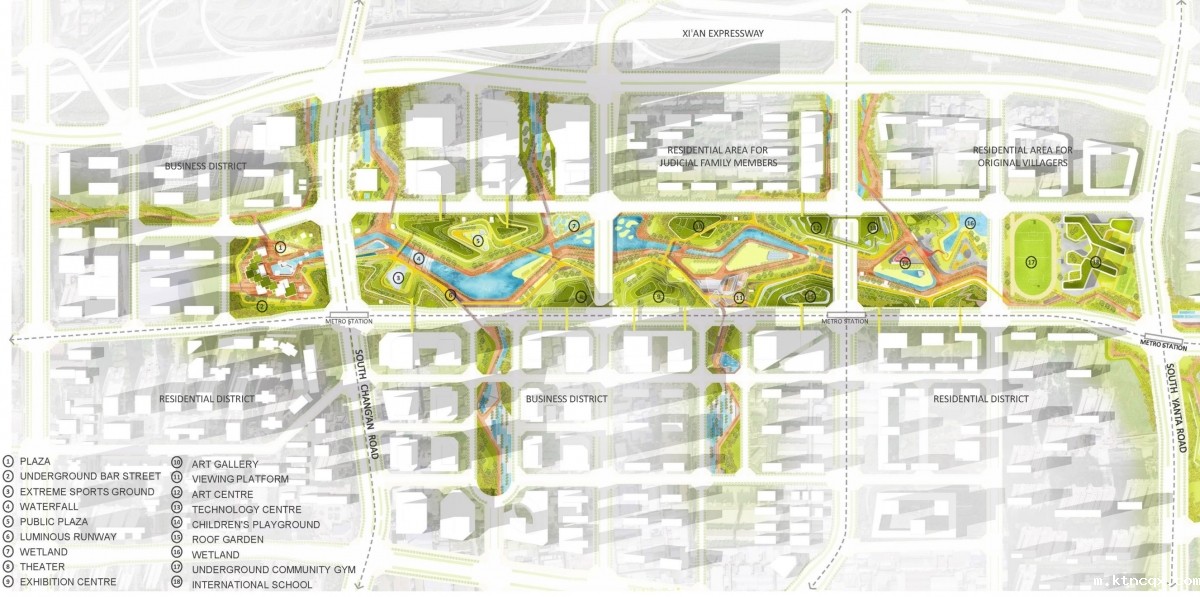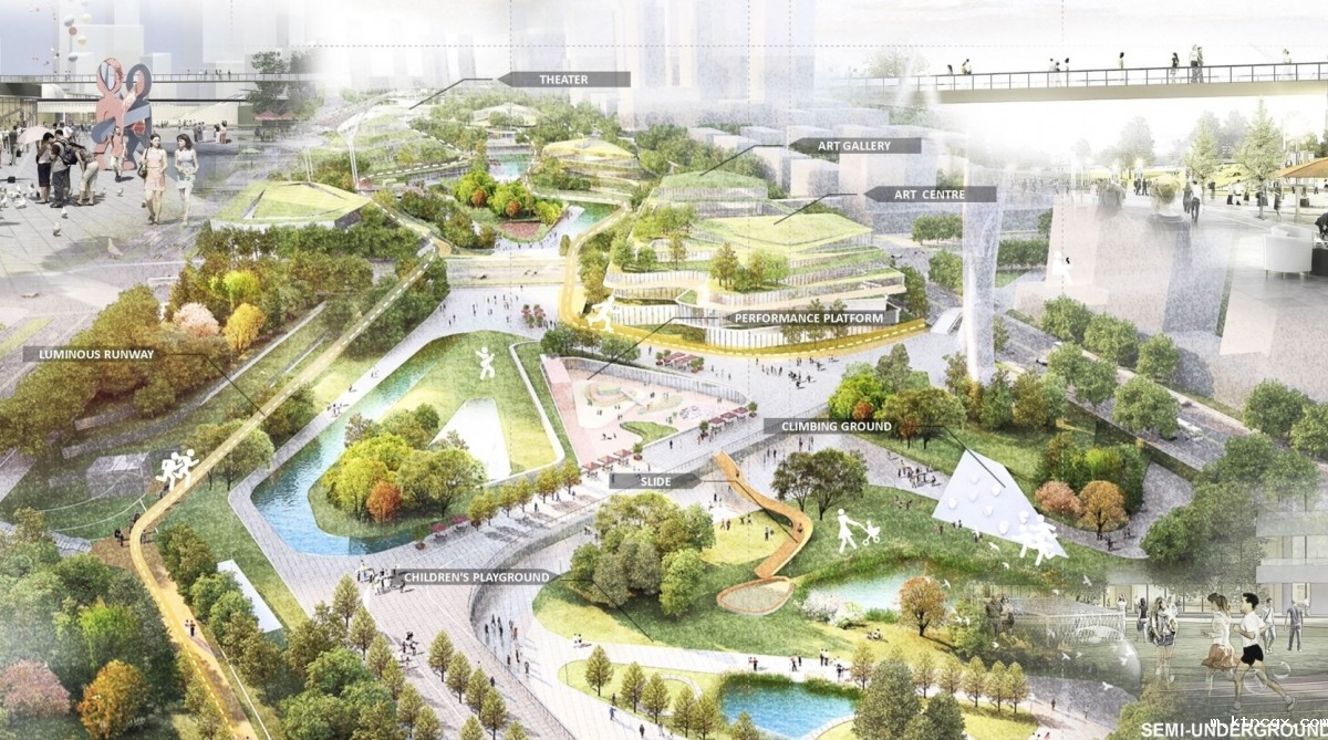 项目作为西安文化CBD片区的核心景观绿轴,复合城市公共文化活动,设置四大文化场馆、休闲商业、学校等,结合地铁站在基地内构建TOD接驳系统,打造集文化场馆、商业、市民公园等为一体的多尺度休闲空间,打造面向国际、活力多元、绿色生态的文化博览公园。