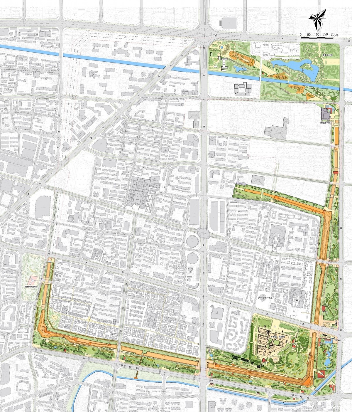 护砌:城垣墙体根部的石材护砌与排水设计;直路:沿城垣以直线步道为骨架的曲直有序园路体系;层次:凸显城垣遗址本体的三个景观空间层次带;再利用:精心评估和安排原有景观元素的再利用。