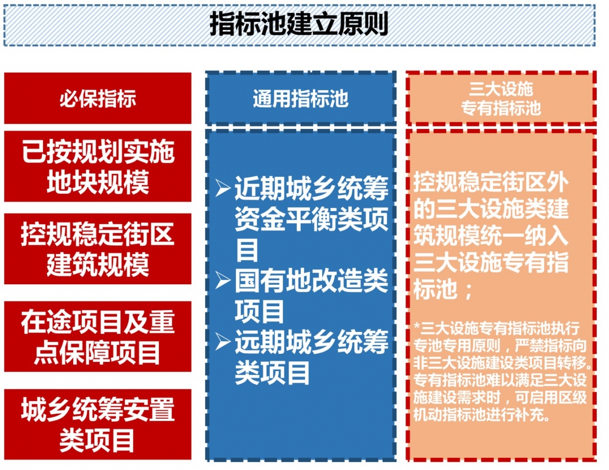 以实施为导向,梳理全区资源与任务、建立与资源任务相匹配、刚性与弹性相结合的指标传导体系,保障上位规划刚性要求的传导落实,为推动全区项目实施保驾护航。建立“区级弹性指标池”,明确指标池的使用规则和流量管控规则,实现建设指标“分时序、按项目”的精细化配给,成为“减量提质”发展的有效调控手段。