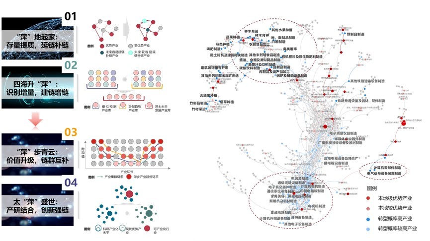 本项目基于多源大数据,融合空间分析、复杂网络分析、机器学习等技术,使用先进的智能算法解析产业发展规律,科学定量化对产业健康发展进行精准引导。项目明确现状条件、所处阶段、定位目标,借助产业图谱、机器学习、价值图谱及专利图谱等智能算法,通过四大路径推演产业发展方向,定位发展潜力较好的产业,提升园区转型升级能力。