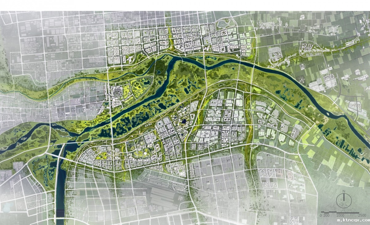 加强河与城、田与城的双向渗透,规划基于生态敏感性分析,结合生态敏感区域对滨河生态廊道进行拓展,叠加地形汇水、通风廊道、生物迁徙廊道,搭建区域生态网络,形成山水林田草滩一体化生态基底,构建多元生命共同体。同时,提出城市开发强度与整体高度控制要求,为保护鸟类迁徙,重点控制沿河一线建筑高度在50m以内,整体形成溶城于水、藏城于林的城市空间形态。