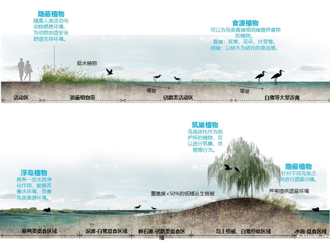 渭河是黄河水系输沙量最大的二级支流,泾河年均含沙量28900万吨,导致大量泥沙在片区交汇聚集,淤积风险大,因此,需要建立长效清淤机制,进行分区疏浚。规划提出干扰有序腾退、水网体系构建、土壤多维修复、植被自然恢复的河道疏浚与滩地治理策略。通过退耕还滩、退坑还塘、退渔还湿、联通水系、增加滞洪空间等措施,增强水动力,实现水体自净;通过实施多种土壤改良措施、分区分段复育,形成与环境相适应的自然群落,建立人与自然共生关系。