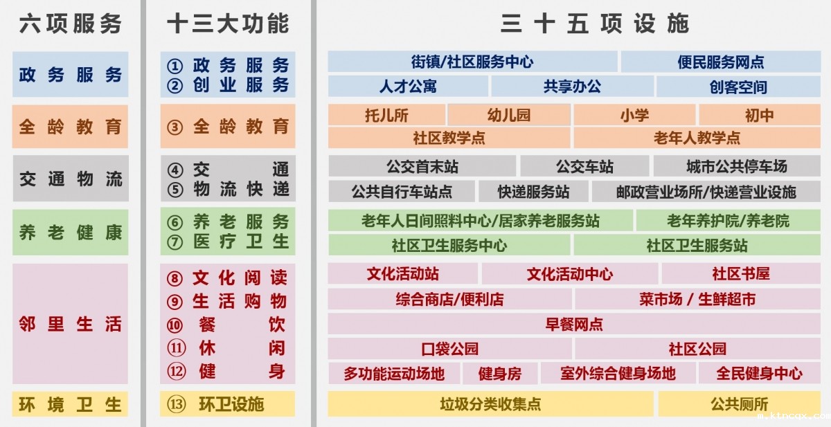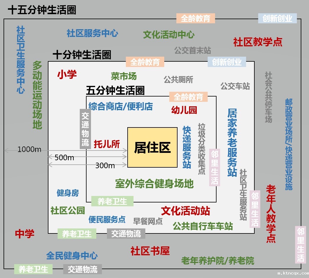(1)功能要素方面:体现高新区高品质、高成长、高投入的区域特点,分别从创新创业、全龄教育、交通物流、养老卫生、邻里生活5个方面构建核心功能体系。细化二级功能13项,落实35项公共服务设施。依据设施服务半径及使用频率,按照五分钟、十分钟、十五分钟三个圈层分级配置。
