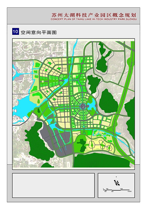 ●“一心”:除中心公园外,主要为创意产业基地,为“十字”景观轴交汇的中心,寓意“科技之光,圆珠似月”的“太湖银珠”。