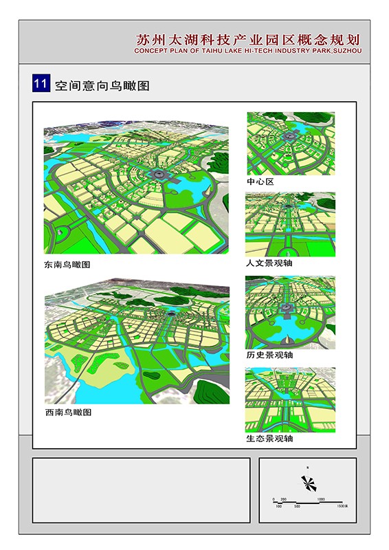 ●城市轴线:除了上述“半圆形”生态主骨架之外,设计了一个“双十字”组成的“井字型”景观轴线。即人文景观轴,历史景观轴,生态景观轴和省道交通景观轴。