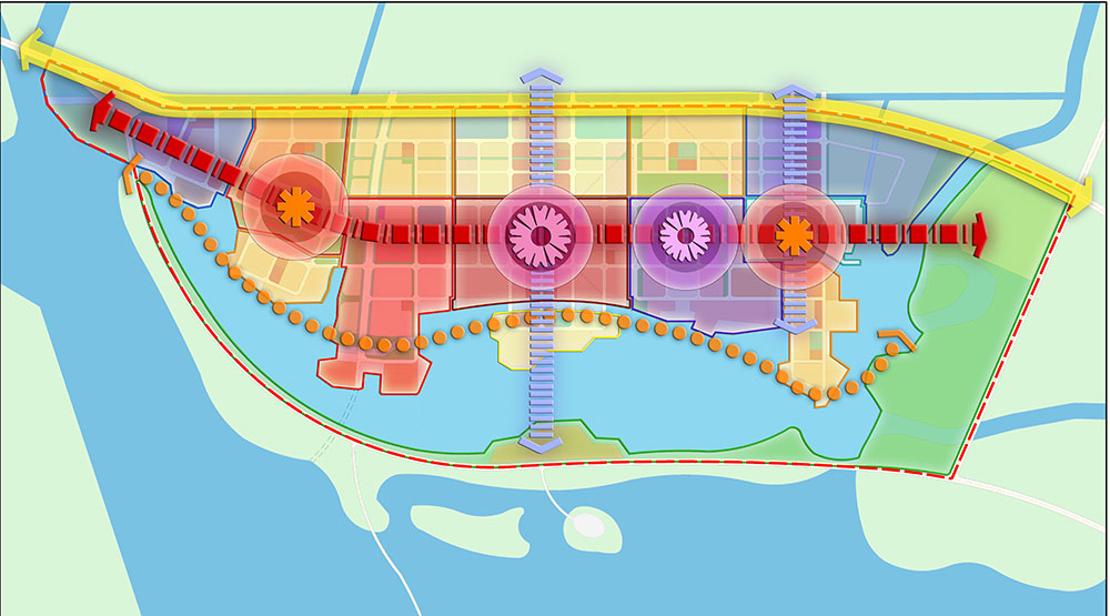 以轨道交通为骨架、以生态廊道为分隔、以密集水网为脉络、以公共设施为核心、以居住功能为本底、以生态指标为保证。