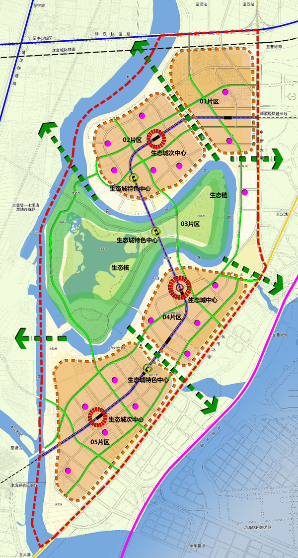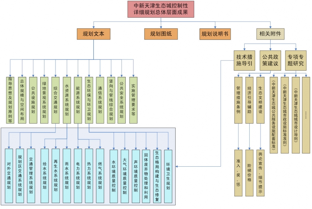 本规划依据《中新天津生态城总体规划》,分解落实人口、用地和建设规模指标,深化落实公共服务设施、交通和市政基础设施、公共安全设施,统筹整合功能定位、产业选择、道路交通、绿地景观等要素,圆满达成了中、新双方关于用地、建设量等要素的控制、分配目标,有效的指导了片区、街区、生态细胞层面的控规编制工作。