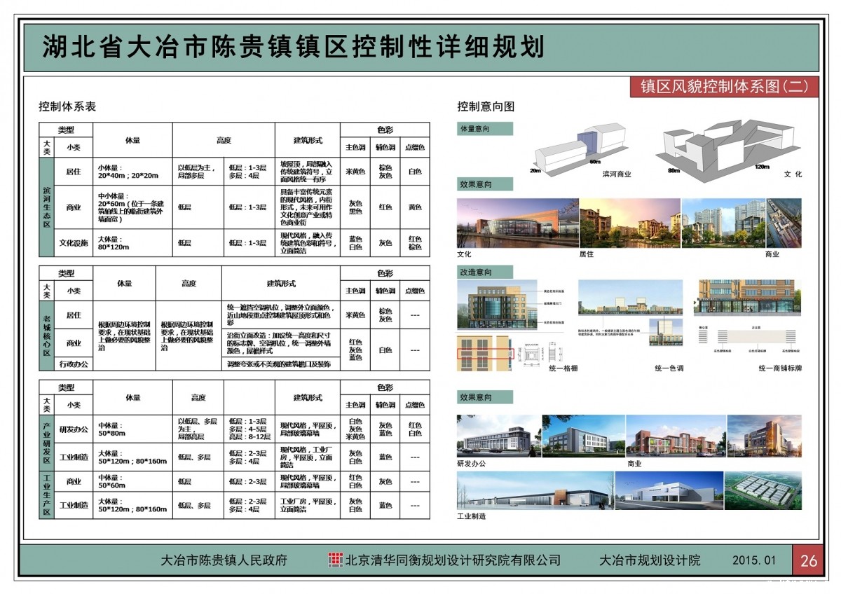 依据城镇职能与地形地貌特征,将镇区分为滨河生态区、旅游活力区、新城综合区、老城核心区、产业研发区和工业生产区分别进行建筑风貌控制。为了弹性的控制城市风貌,规划设计采用风貌分级控制的原则,将用地分为重要控制区与一般控制区,并对重要控制区进行严格的指标控制,对重要的景观要素和界面进行规划引导,从而整体把控镇区的景观环境,进一步展现小城镇风貌特色。