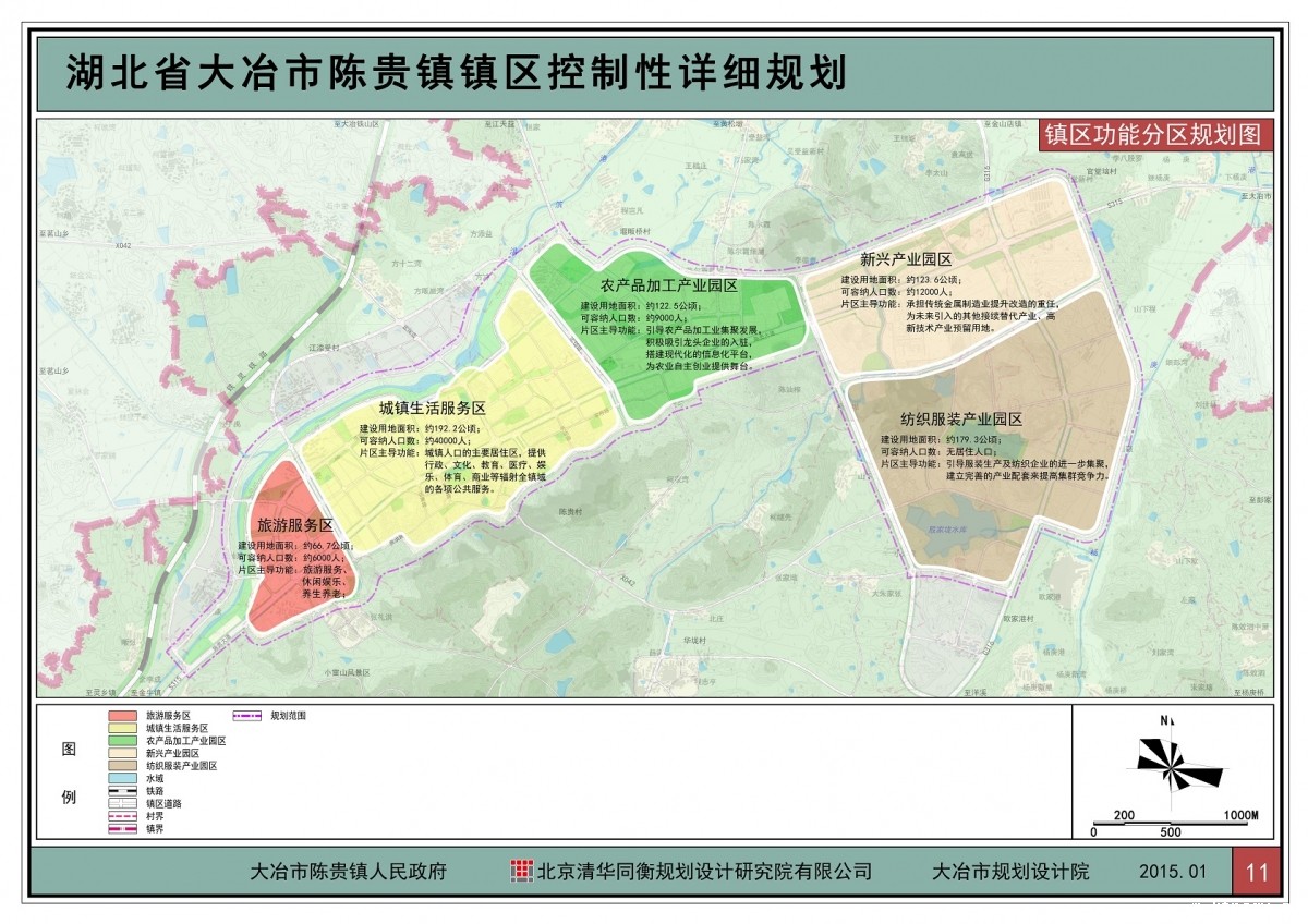 在黄石、大冶市资源枯竭型城市转型发展大背景下,大冶市改变过去“一矿独大”的局面,促进产业细分开始向镇域经济转移,在区域开放格局下,陈贵镇作为大冶市重点镇、全国重点镇,应积极考虑承接城市产业转移形成专业化发展态势,产业发展将吸引外来人口集聚、本地人口城镇化和大城市人口回流,从而形成镇区人口适度增长。规划预测至2020年,镇区人口规模达3.5-4万人,至2030年,镇区人口达6-7万人。