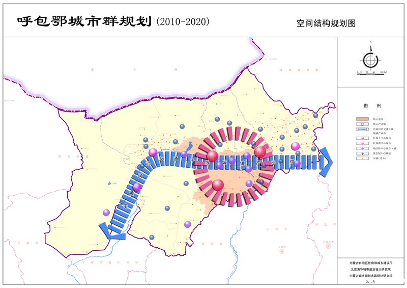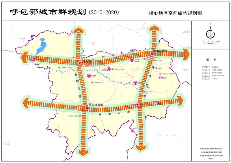 规划提出按照呼包鄂城市群的现状特征和发展趋势,进一步优化城市空间布局,推动区域协调发展,形成以呼包鄂核心地区为重点发展区域,以沿黄河沿交通干线城镇产业带为重点发展轴带,以区域中心城市和县城两级城镇为多中心的城镇空间格局,在呼包鄂核心地区建设井字型发展走廊。