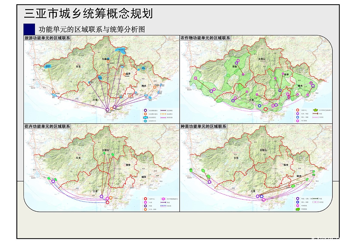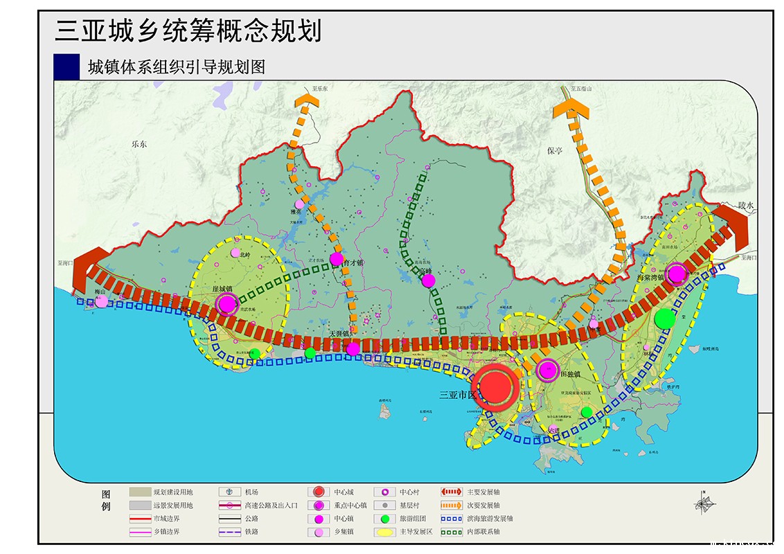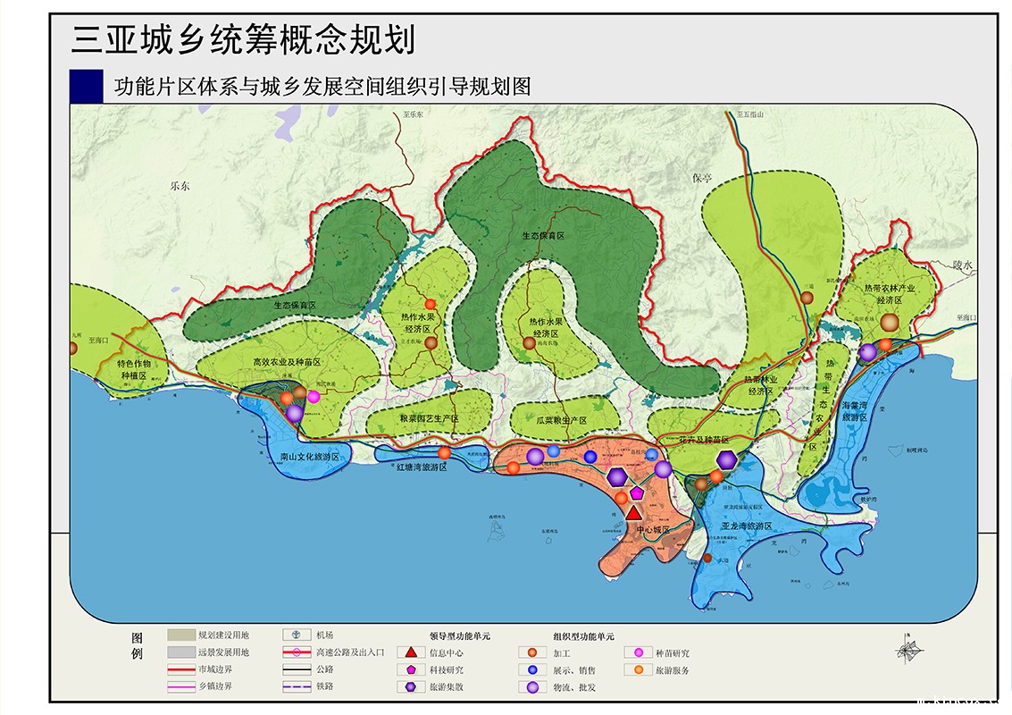 按照这样的思路,对规划要素的组织引导也有了更明确的方向性支撑,即:三亚未来的发展将以引导四个相对集中的“主导发展区域”为主,其中崖城和南滨农场一带应成为带动三亚、乃至五指山南部地区的外向型农业的组织核心,是三亚农业发展的龙头和实现多轮驱动的关键。同时,按照这样的组织引导,也将以不同功能片区的不同形象和面貌,展现三亚城乡建设的新风格和新局面。