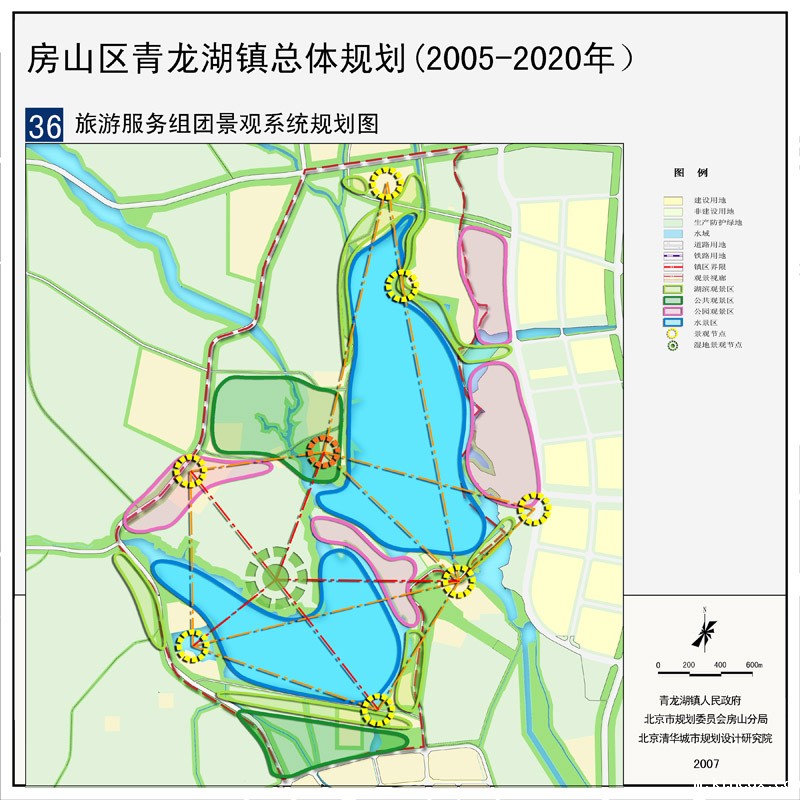 旅游服务组团是青龙湖镇产业就业中心,依托崇青水库发展旅游产业,成为房山区旅游会展基地,解决城镇人口的广泛就业。组团内部环湖形成以水体景观为中心、散点布局旅游服务设施的整体景观布局,加强节点的景观呼应,营造人工景观和自然景观和谐共生的特色旅游资源。