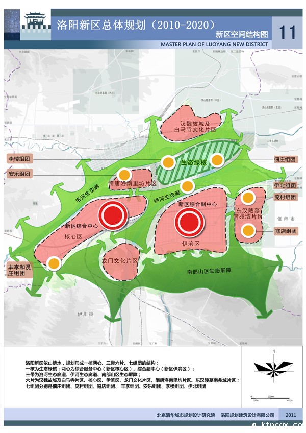新区按照 “一核两心、三带六片、七组团”的总体布局结构稳步推进各项建设:“一核”是伊洛河之间的生态绿核;“两心”指核心区综合中心与伊滨区中心区综合副中心两个重点发展核心;“三带”指洛河生态走廊、伊河生态走廊、龙门山-万安山生态屏障;“六片”指北部白马寺及汉魏故城文化片区、隋唐洛南里坊文化片区、核心区、伊滨区中心区、东汉陵墓南兆域文化片区、龙门文化片区;“七组团”指佃庄组团、庞村组团、寇店组团、丰李组团、安乐组团、李楼组团、伊北组团等八个城乡一体化发展组团。