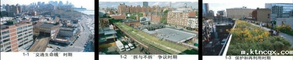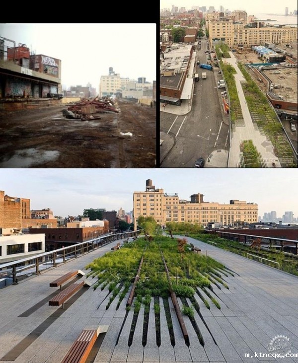 流程:1934-1980年为“交通生命线”时期,1980-2999年为“拆与不拆”的争议时期,1999年至今,是保护和再利用时期,改造前场地是荒废、破败、杂草丛生的场景。2009年,高线公园(High Line)第一段预示第一个有工业背景环境的城市公园的诞生,2011年,第二段有肉类包装区及切尔西住宅区的背景环境,所以在景观的设置上既有城市所展示的调性、又有社区公园的温暖和安静,2014年,第三段新建了长凳、铁轨步行道、表演空间以及为孩子们准备的游戏场等。