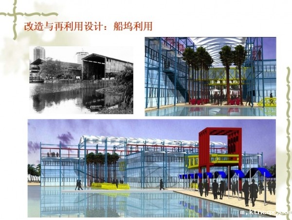 作为一个有近半个世纪历史的旧船厂遗址,过去留下的东西很多:从自然元素上讲,场地上有水体,有许多古榕树和发育良好的地带性植物群落,以及与之互相适应的生境和土壤条件。从人文元素上讲,场地上有多个不同时代船坞、厂房、水塔、烟囱、龙门吊、铁轨、变压器及各种机器,甚至水边的护岸,厂房墙壁上的“抓革命,促生产”的语录。