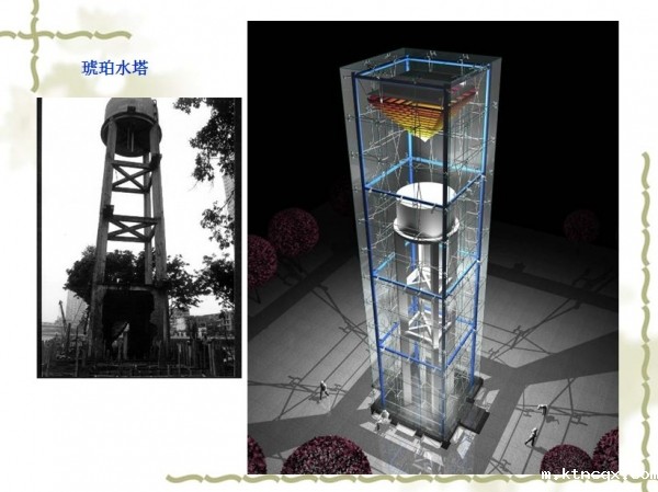 不同于琥珀水塔的加法,场地中的另一个水塔则采用了减法设计:剥去其水泥的外衣,展示给人们的是曾经彻底改变城市景观的基本结构--线性的钢筋和将其固定的结点,它告诉人们,无论工业化的城市多么丑陋,抑或多么美丽动人,其基本结构是一样的。正如世界上的男人、女人,高贵者和低贱者一样,最终归于一副白骨。这一设计是对工业建筑的戏剧化的再现,从而试图更强烈地传达关于本场所的体验。(注:因施工过程中发现该水塔原结构安全问题,不能完全按设计处理旧水塔,最终作品为原大小重新用钢制作)。